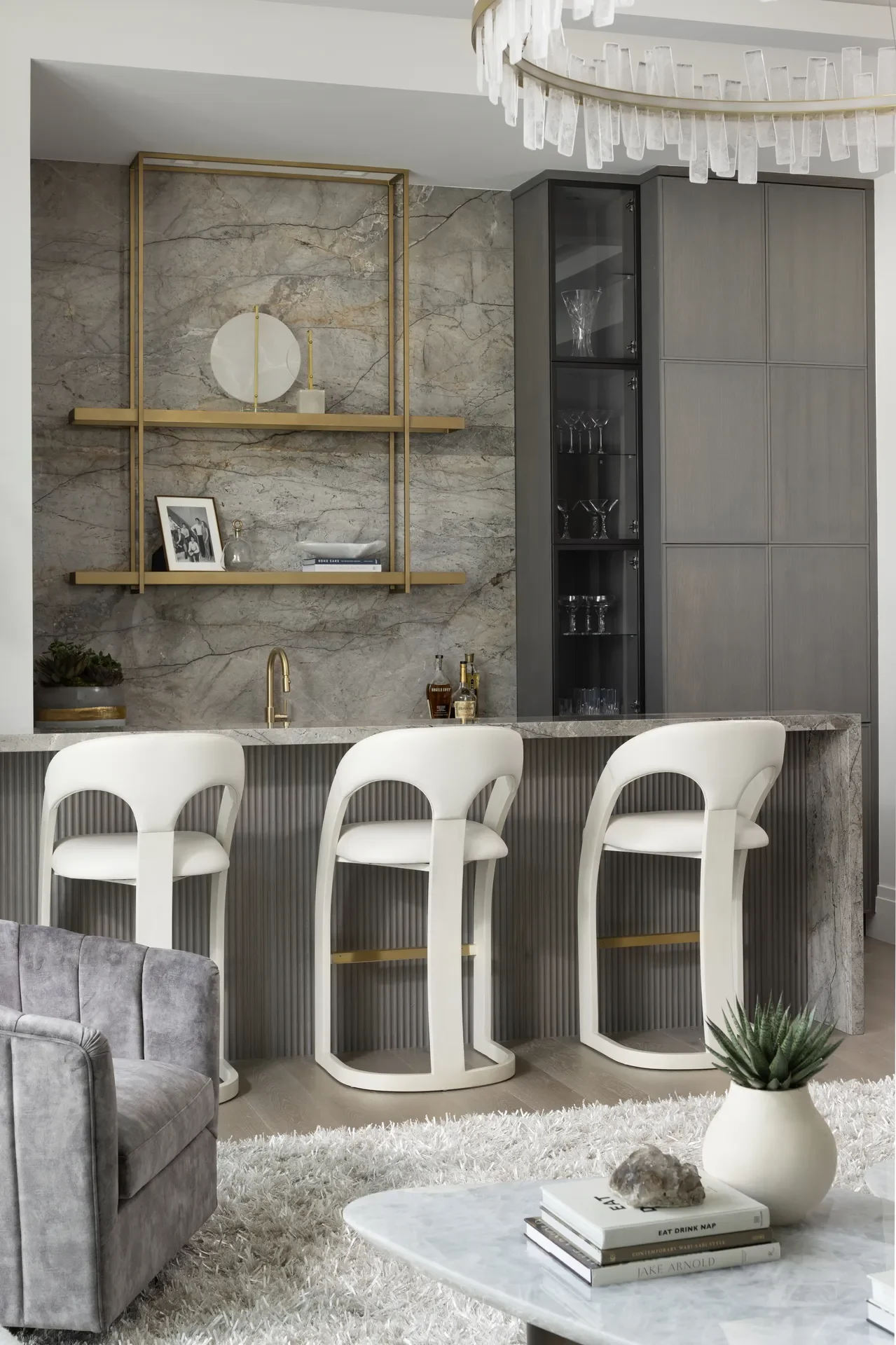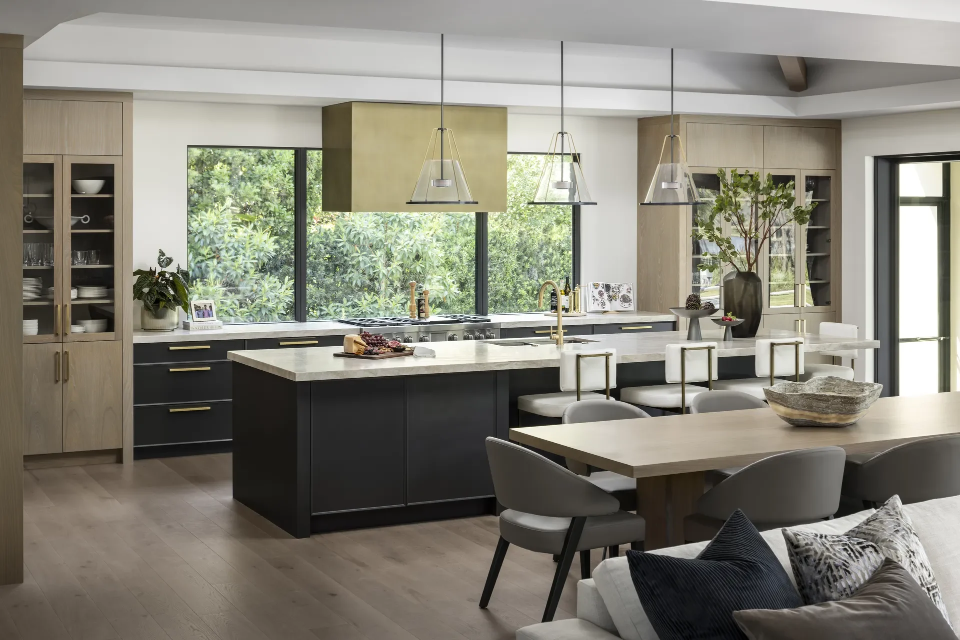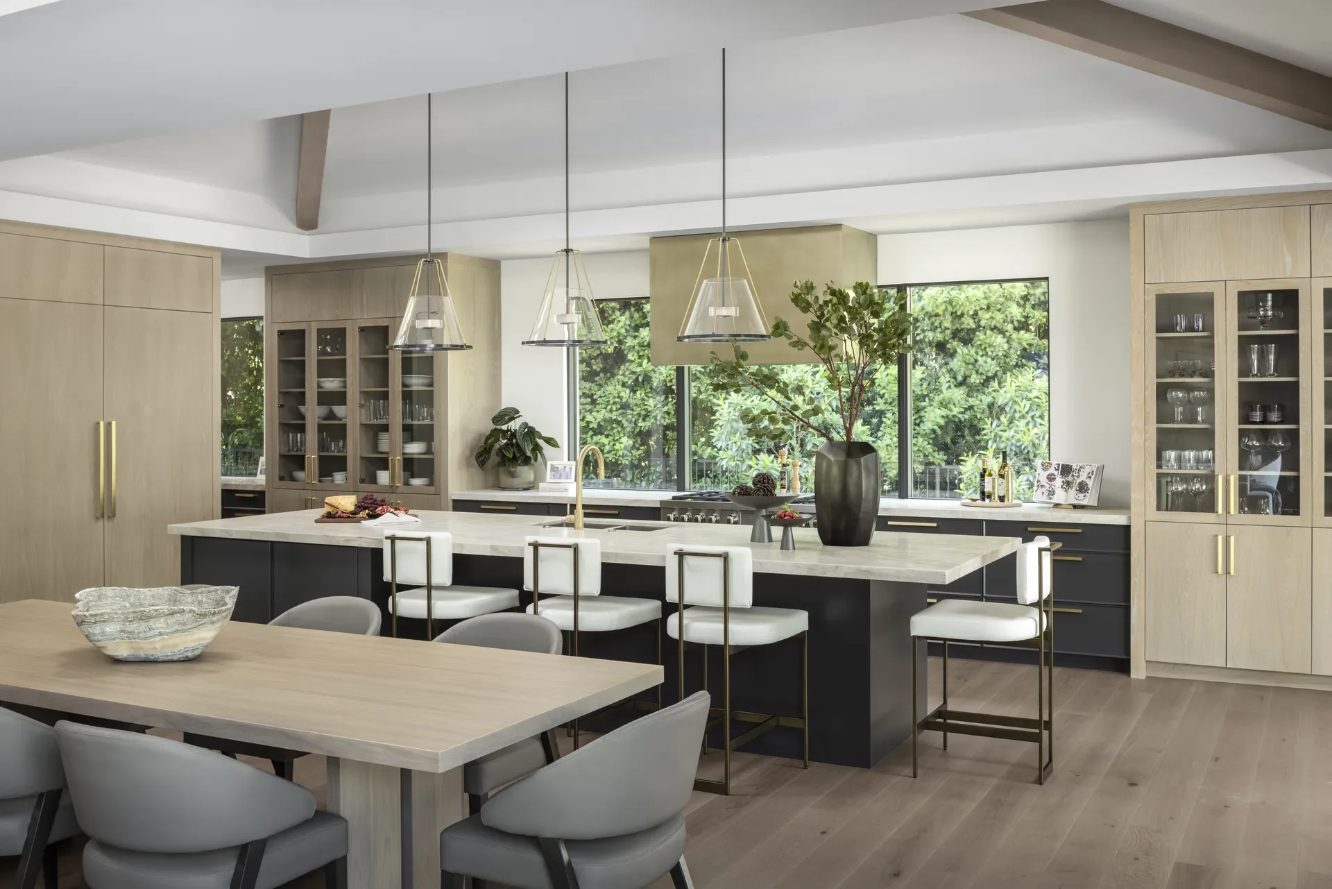 Stripped back to its architectural core, this transitional home was reimagined with intention—crafted to support both everyday life and effortless entertaining. The interiors are rooted in organic materials: softly grained white oak, limestone, and bronze. The design emphasizes balance—pairing clean lines with richly textured details. Layered paneling adds tailored dimension to the walls, while artisanal lighting, at once sculptural and functional, introduces a sense of textural dialogue. Designed for a large, active family, the layout flows with ease, offering expansive gathering spaces balanced by moments of calm and intimacy. Every detail was considered for both beauty and function, resulting in a richly detailed home that feels elevated yet designed for everyday life.