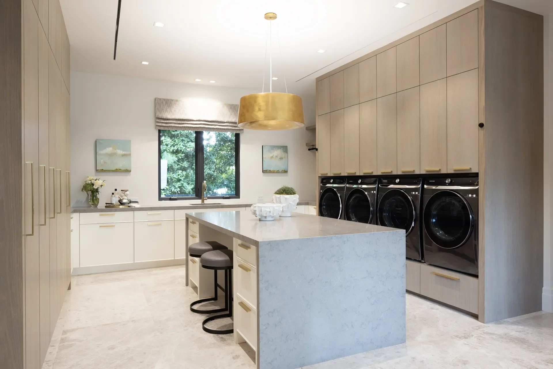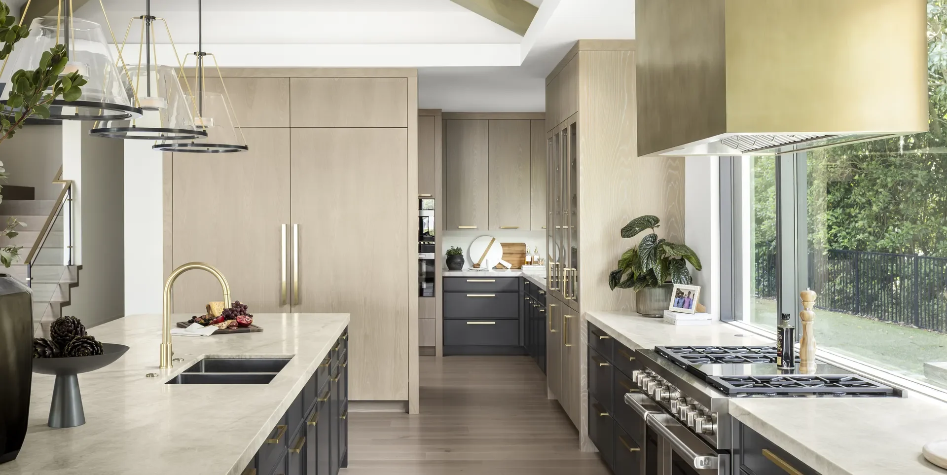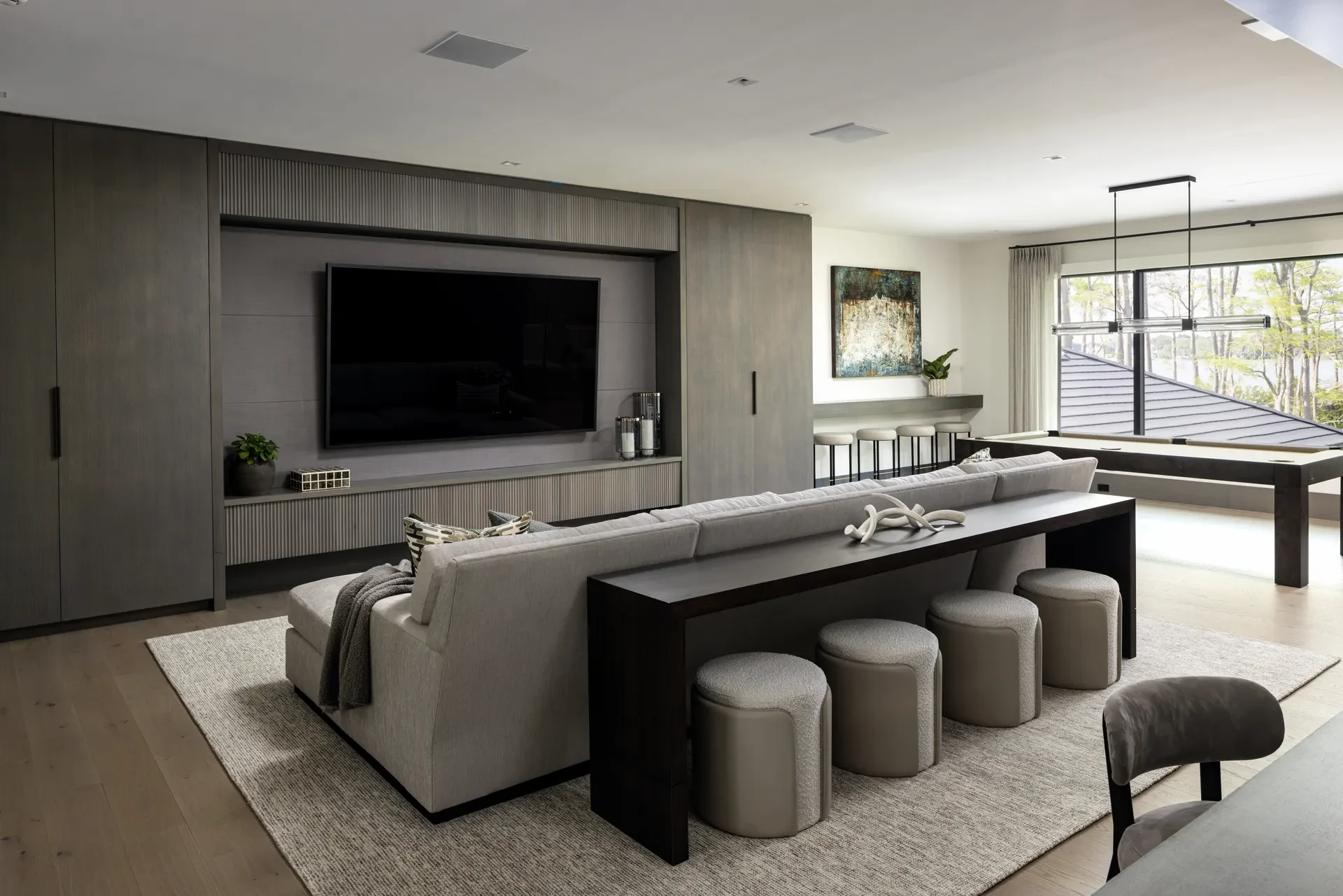 Stripped back to its architectural core, this transitional home was reimagined with intention—crafted to support both everyday life and effortless entertaining. The interiors are rooted in organic materials: softly grained white oak, limestone, and bronze. The design emphasizes balance—pairing clean lines with richly textured details. Layered paneling adds tailored dimension to the walls, while artisanal lighting, at once sculptural and functional, introduces a sense of textural dialogue. Designed for a large, active family, the layout flows with ease, offering expansive gathering spaces balanced by moments of calm and intimacy. Every detail was considered for both beauty and function, resulting in a richly detailed home that feels elevated yet designed for everyday life.