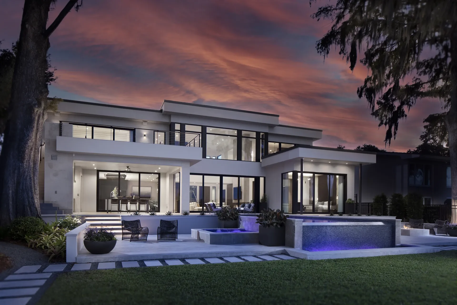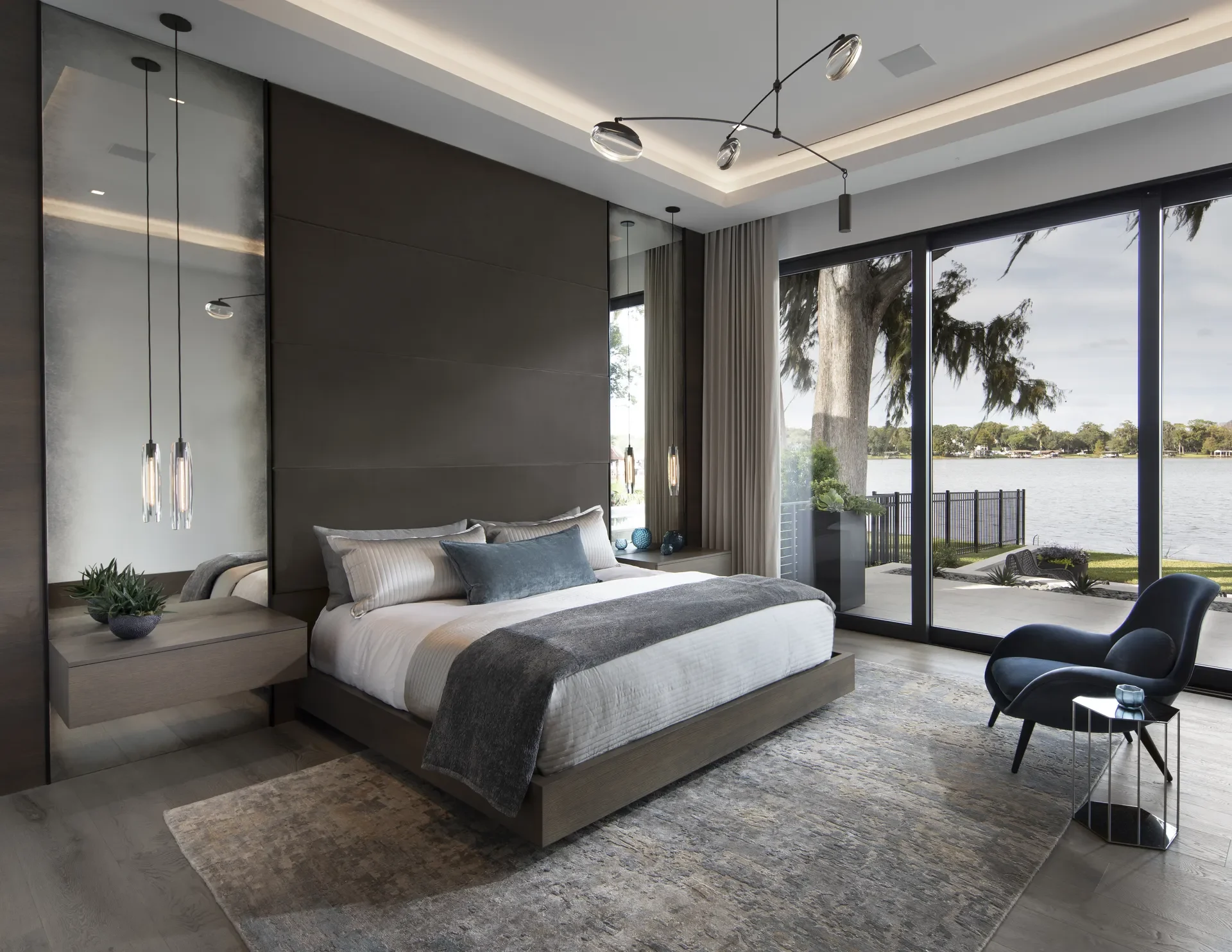 Rooted in the principles of organic architecture, this Frank Lloyd Wright–inspired residence was designed to dissolve the boundaries between landscape and structure. Clean horizontals, deep overhangs, and warm, earthen materials create a subtle dialogue between the built and natural environments. Inside, walls of glass frame the lake beyond, allowing shifting light and reflections to animate the interiors. An architectural staircase, custom made in Italy, acts as a central gesture, anchoring the space with elegance and precision. Materiality takes center stage: white oak, limestone, and bronze are layered with discipline and softness. Every line, finish, and opening is intentional—designed to support a modern lifestyle while honoring the ethos of timeless craftsmanship and connection to place.