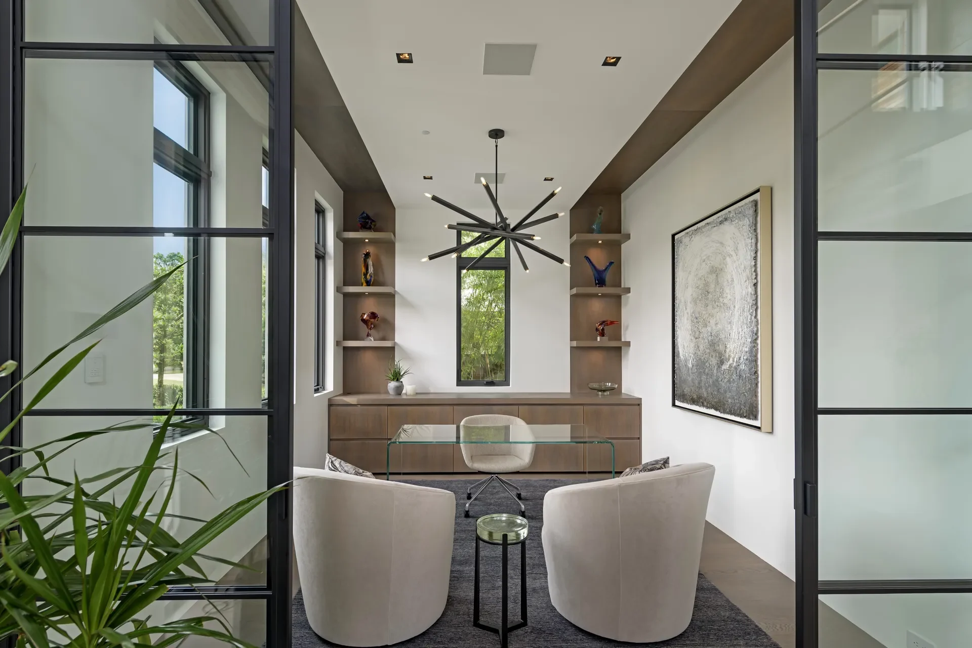 Lacuna House was conceived as an expression of quiet modernism. Natural materials, clean lines, and intentional voids create space for reflection. The home’s architecture embraces the interplay between mass and openness, with horizontal rooflines, expansive glazing, and deeply cantilevered overhangs that blur the threshold between indoors and out. Inside, the palette remains grounded: white oak, limestone, and walnut-clad ceilings lend warmth to restraint. Moments of composed grandeur—a floating stair, monolithic hearth, or recessed gallery niche—are balanced by intimate zones designed for pause. Every gesture is deliberate, lending the house a meditative clarity that honors both setting and structure.